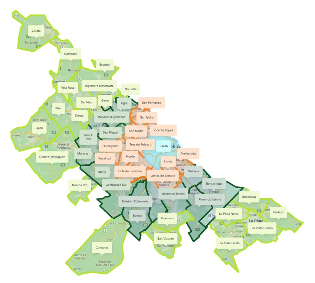 Almirante Brown – Avellaneda – Berazategui – Berisso – CABA – Campana – Del Viso – Derqui – Ensenada – Escobar – Esteban Echeverría – Ezeiza – Florencio Varela – Garín – Guernica – Hurlingham – Ingeniero Maschwitz – Ituzaingó – José C Paz – La Matanza Norte – La Matanza Sur – La Plata Centro – La Plata Norte – La Plata Oeste – Lanús – Lomas de Zamora – Malvinas Argentinas – Merlo – Moreno – Morón – Nordelta – Pilar – Quilmes – San Fernando – San Isidro – San Martín – San Miguel – San Vicente – Tigre – Tres de Febrero – Vicente López – Villa Rosa – Zárate
