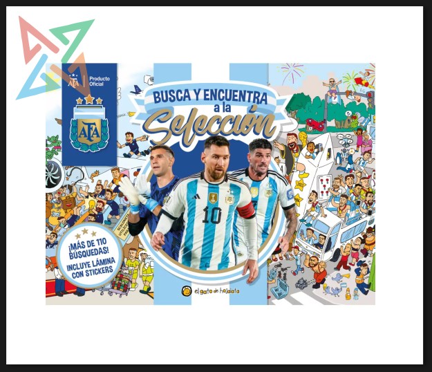 Libro de búsqueda visual inspirado en la Selección Argentina, con desafíos para encontrar jugadores, objetos y escenas futboleras.
