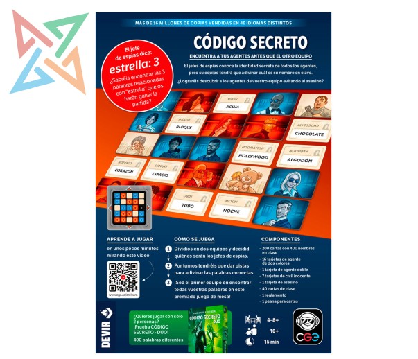 Los equipos competirán para ver quién consigue contactar primero con todos sus agentes. Cada jefe de espías dirá en su turno una pista compuesta por una sola palabra que puede referirse a varias de las palabras que hay en el tablero. Sus compañeros de equipo intentarán adivinar esas palabras evitando señalar las palabras del equipo rival. Y sin que nadie encuentre al asesino…