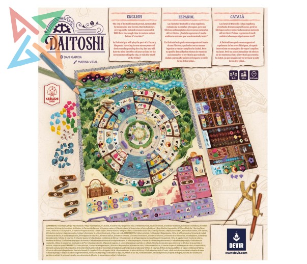 En tu turno en Daitoshi, produces o mueves a tu magnate a un nuevo distrito en el que podrás enviar a tus trabajadores a trabajar, ordenar la explotación de hexágonos de bosque o río para alimentar tu interminable necesidad de vapor, y realizar una acción para expandirte y mostrar tu grandeza a la ciudad.