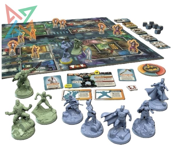 6 miniaturas de Superhéroes, 4 miniaturas de Héroes Zombis, 6 figuras de Transeúntes, 50 figuras de zombis, 4 peanas de colores, 8 indicadores, 4 medidores de Experiencia, 6 dados, 4 módulos de tablero de doble cara, 6 tarjetas de, identificación, 83 minicartas, 35 fichas, 1 reglamento