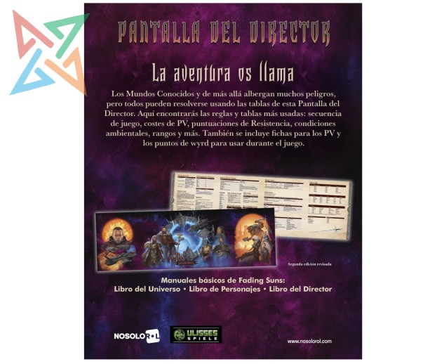 Los Mundos Conocidos y de más allá albergan muchos peligros, pero todos pueden resolverse usando las tablas de esta Pantalla del Director. Aquí encontrarás las reglas y tablas más usadas: secuencia de juego, costes de PV, puntuaciones de Resistencia, condiciones ambientales, rangos y más. También se incluye fichas para los PV y los puntos de wyrd para usar durante el juego.