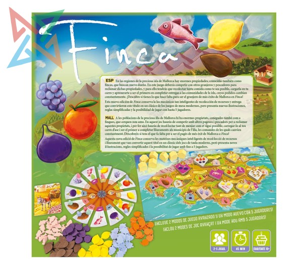 Esta nueva edición de Finca conserva las mecánicas de recolección de recursos y entrega que convirtieron este título en un clásico de los juegos de mesa modernos, pero presenta nuevas ilustraciones, reglas simplificadas y la posibilidad de jugar con hasta 5 jugadores.