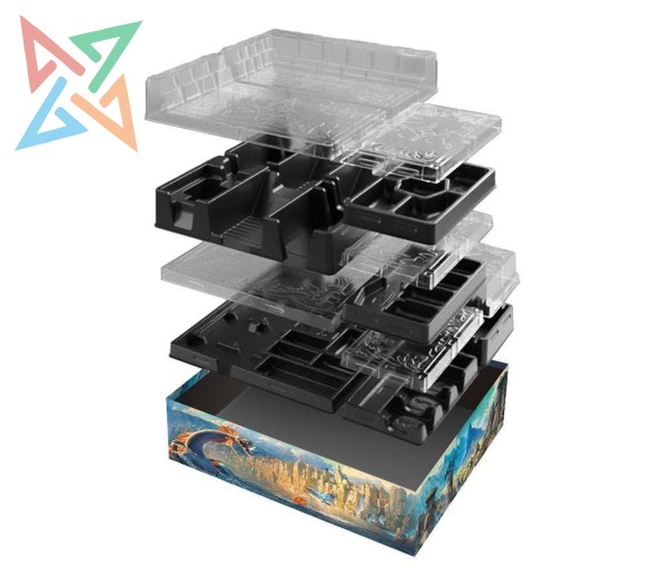 El Cofre de Aventuras incluye un inserto compacto que sirve para conservar todo el contenido publicado de Las ruinas perdidas de Arnak y al mismo tiempo simplificar al máximo la preparación de cada nueva partida. El inserto consta de 8 cajas individuales donde se almacenan todas las fichas, losetas y cartas, ¡incluso si están enfundadas!