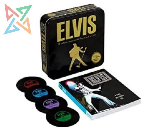 Set de posavasos en forma de mini discos de vinilo inspirados en Elvis Presley. La lata decorativa mantiene los posavasos organizados y es perfecta para coleccionistas y fans del rey del rock.