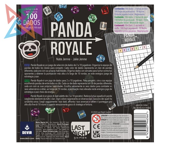 Diseñado por Nate Jenne y Jake Jenne, Panda Royale se puede disfrutar en pareja o en grupos de hasta 10 jugadores, a partir de 8 años, en sesiones de entre 20 y 30 minutos de duración. A lo largo de la partida trataremos de sumar la mayor cantidad de puntos tras varias rondas lanzando dados de distintos valores. Tras sumar la puntuación de las 10 rondas, quien haya obtenido la mayor cantidad de puntos se alzará con la victoria.