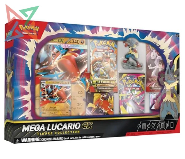 Colección con figura de Mega Lucario EX y cartas promocionales del Pokémon TCG. Incluye sobres de expansión y contenido exclusivo, pensada para coleccionistas en idioma inglés.