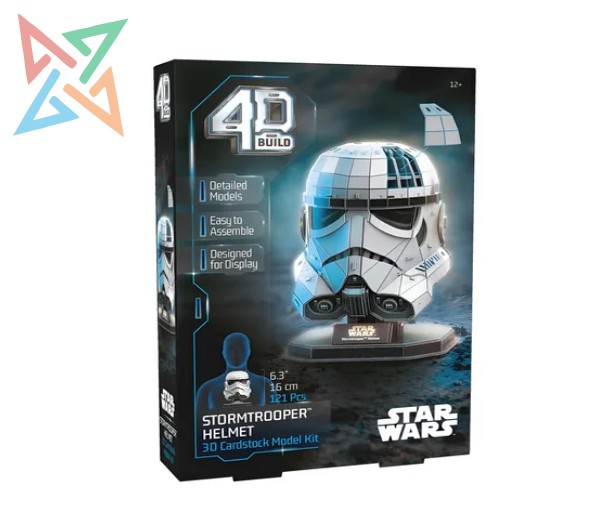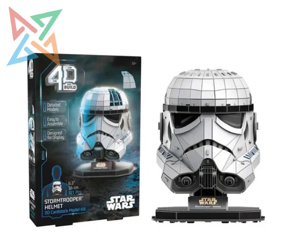 Este puzzle 4D Build permite armar en 3D el clásico casco Stormtrooper, uno de los símbolos más reconocibles de Star Wars. Con 121 piezas, propone un desafío mayor y un resultado espectacular para exhibir. Perfecto para coleccionistas, fans de la saga y amantes de los rompecabezas.
