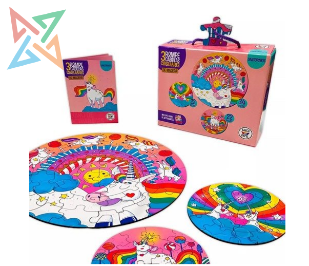 ROMPECABEZAS PUZZLE BARCO DE PAPEL: CIRCULARES de MADERA x 3 (De 34 y 22 piezas) – Unicornios (Incluye Libro de Actividades)