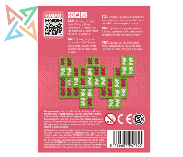 Spring , creado por María y Enrique Blasco, propone un duelo estratégico para dos jugadores dividido en dos fases distintas. En la primera, ambos jugadores construyen un jardín compartido superponiendo cartas por turnos: hacer florecer tus flores y bloquear las de tu oponente será clave para ganar jardines pequeños. En la segunda, cada jugador roba cartas del espacio compartido para diseñar su jardín personal, cuyo objetivo es formar el grupo más grande de flores conectadas.