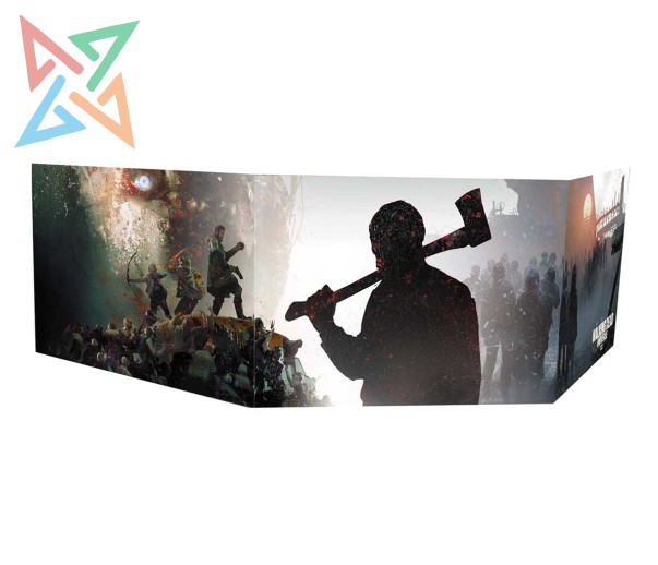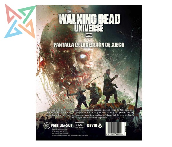 Una pantalla de Dirección de juego en formato apaisado para el Juego de Rol oficial de The Walking Dead Universe. Con arte de Martin Grip en el exterior y una gran variedad de tablas útiles en el interior, mientras mantiene ocultos los planes del Director de Juego de los ojos curiosos de los jugadores.
