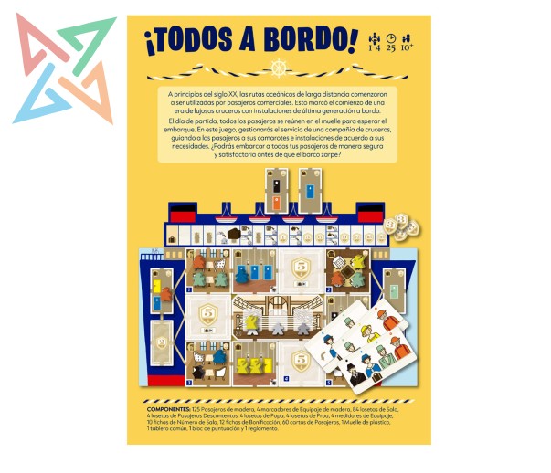 ¡Todos a bordo! es un juego de mesa para 1 a 4 jugadores en el que compites para subir pasajeros en tu crucero de lujo, llevándolos a sus camarotes y salas favoritas. Los jugadores pueden disfrutar de un juego delicioso, reflexivo, brillantemente ilustrado, de reglas sencillas, pero de desarrollo desafiante.