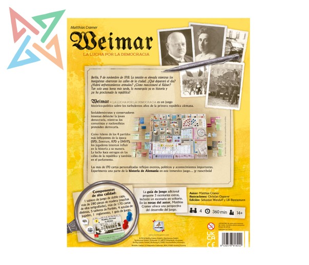 Socialdemócratas y conservadores intentan defender la joven democracia, mientras los comunistas y nacionalistas pretenden derrocarla. Como líderes de los 4 partidos más influyentes de la época (SPD, Zentrum, KPD y DNVP), los jugadores intentan influir en la historia a su manera. La lucha hace estragos en las calles de la república y también en el parlamento. Las más de 170 cartas reflejan eventos, políticos y acontecimientos importantes. Experimenta una parte de la historia de Alemania en este inmersivo juego… ¡y reescríbela!